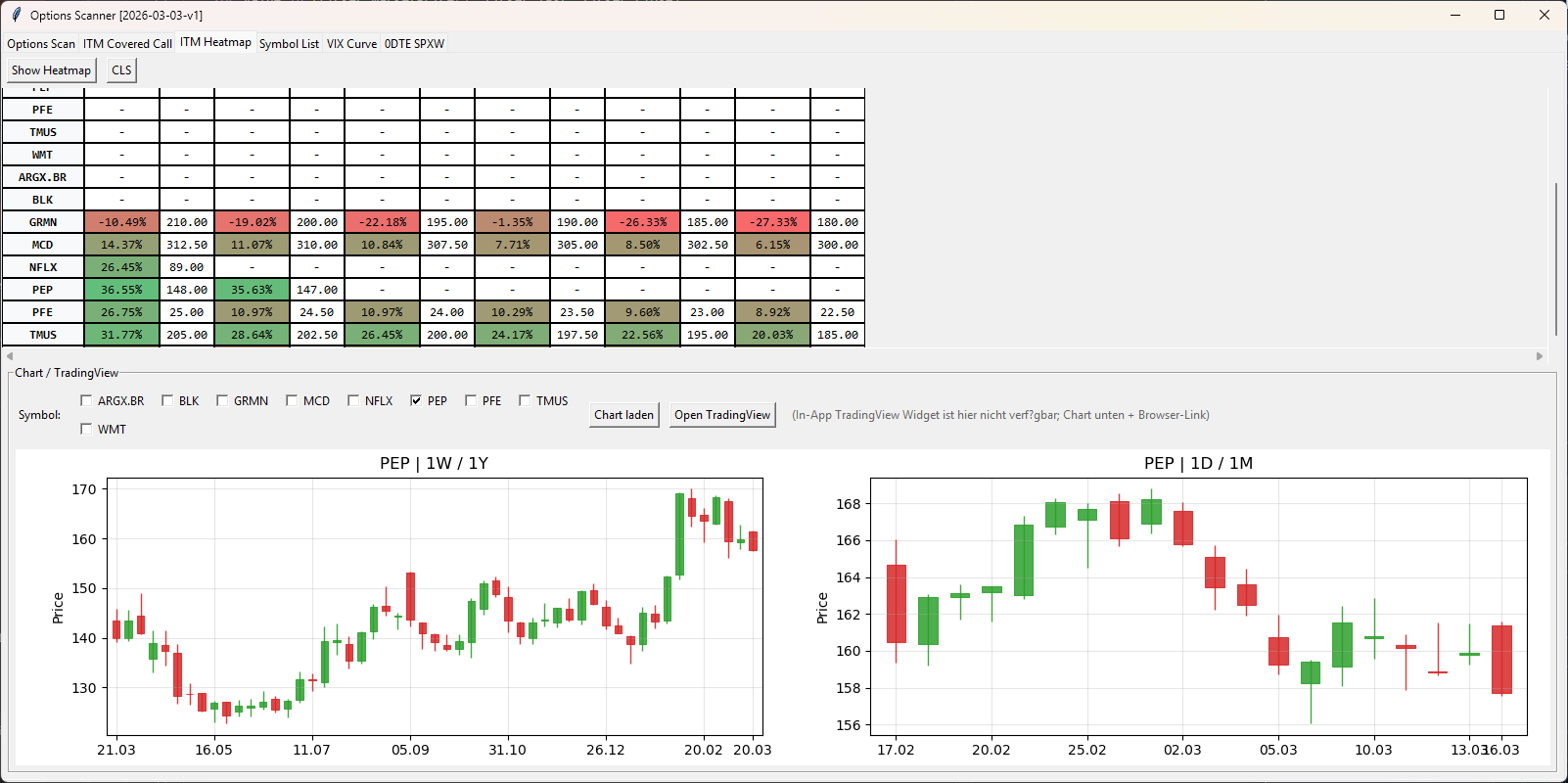 - Strike-Logik Der gewählte ITM-Strike bleibt unter dem Expected Move des Zyklus.